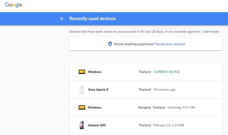 ง่ายสุดคือเข้าที่เว็บไซต์ https://myaccount.google.com/device-activity ตามนี่้เลย เพื่อเข้าถึงรายชื่ออุปกรณ์ที่เราเคย login ใช้งานบัญชีเราบน Google นั่นเอง ซึ่งรวมทั้งคอมพิวเตอร์ แท็บเล็ต และสมาร์ทโฟนทั้ง iOS และ Android ด้วย (หากยังไม่ได้ login ให้ login ด้วยบัญชีผู้ใช้ของคุณ) เมื่อ login สำเร็จก็จะแสดงรายชื่ออุปกรณ์ออกมา ทั้ง Windows และสมาร์ทโฟนเลยทีเดียว