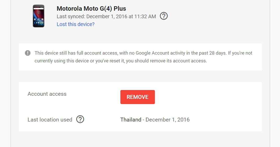 และถ้าเครื่องหายและไม่ได้ใช้งานเป็นเวลานาน ก็จะเตือนเป็นข้อความแบบนี้แนะนำให้ revoke เพื่อสั่ง logout บัญชี google บนอุปกรณ์นั้น